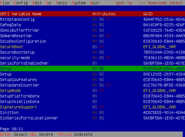 5.更改BIOS隐藏选项一般只需要ALT + C打开Config菜单选择UEFI Variable 可看到上图所示的BIOS变量区。(也可以直接 ALT + = 打开)